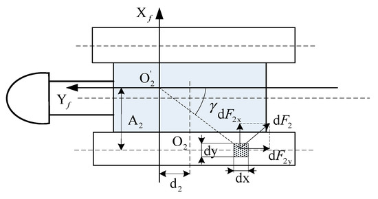 A coordinate system was established using the right track instantaneous velocity center as the origin, the roadheader’s excavating direction as the Y axis, and Y’s vertical axis as the X axis. γ is the angle between one point on the track and the instantaneous velocity center, and μ is the roadway floor resistance coefficient. Because there are different forces on different positions of the track, the resistance and moment can be solved by the unit force analysis method. The force at one point on the track is as shown in Formula (5). The floor frictional resistance to the track can be obtained by the integration of Formula (5), which is shown as Formula (6). and are the vertical and lateral offsets of the track instantaneous velocity center on both sides of the roadheader, is the track width, and is the track length. The steering resistance moment of the roadway floor can be determined by Formula (7).