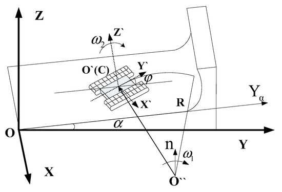 The kinematics of the roadheader in the inclined roadway are not in a two-dimensional plane and must be analyzed in three-dimensional space by the space vector method. The roadway coordinate system OXYZ and the roadheader’s frame body coordinate system O’X’Y’Z’ are established in Figure 2. The roadway excavation direction is the Y axis. The inclination angle of the roadway (the angle between the roadway floor and XOY surface) is , which is the most common inclination of the roadway. The rectification motion in the inclined roadway of the roadheader is a composite movement that includes the rotation of the roadheader about the steering center O” and the rotation of the roadheader’s track ground center O’. Ideally, the instantaneous velocity center of the two track sides should coincide with the geometric center of the track. However, considering the actual speed and road conditions of the roadheader, the centrifugal force may be negligible and track slippage could lead to deviation of the instantaneous velocity center from the track’s geometric center.