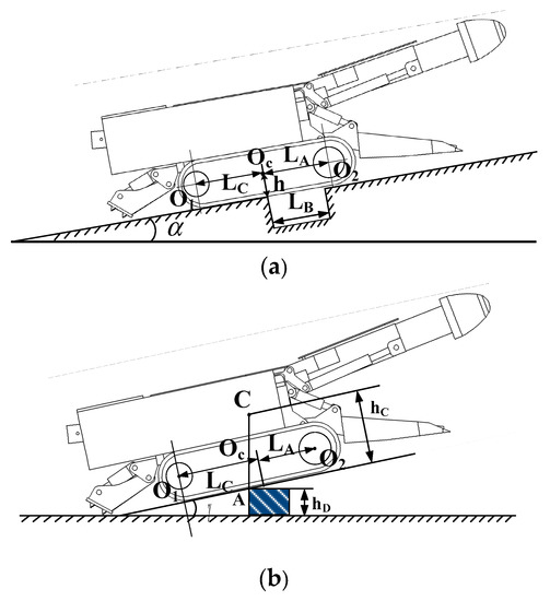 According to Formula (22), the maximum obstacle height that the roadheader can cross in a horizontal roadway is only related to the roadheader structural parameters , , and . The position of the roadheader centroid can be shifted by an inclined roadway, and the maximum vertical obstacle height for an inclined roadway can be obtained by , , and .