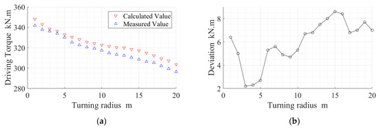 The experimental data of turning motion on a slope are presented in Figure 8, and a comparison between the data calculated by the methods in Section 2.2 and the experimental data are presented in Table 2. Figure 8a shows the relationship between measured torque and calculated torque with turning radius, and Figure 8b shows the relationship between the deviation between measured torque and calculated torque and the turning radius. A hydraulic motor was required to maintain approximately uniform and stable motion throughout the experiment.