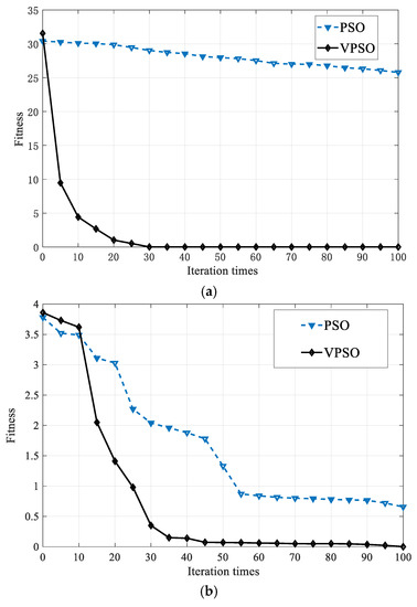 The minimum fitness curve of the two algorithms, PSO and VPSO, (a) The fitness variation of A function, (b) The fitness variation of G function.