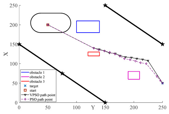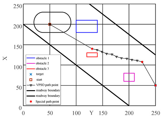Initially, the rectification points should be found in the rectification area and then tracked based on the positions of these special points. Three special points can be selected among the roadheader’s rectification path plan points, then the roadheader can track these marked points. According to the marked points, the total length, total angle, total cost, and safety index of this path can be obtained. A comparison between the special rectification points tracking and the original points tracking is presented in Figure 13 and Table 5.