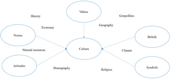 Culture has visible and invisible facets [103]. The invisible facet of culture exists in our mind, e.g., values [115]. The visible side of culture is manifested in human behaviour and social interactions. In addition, elements of culture comprise values [107,115], beliefs [116], attitudes [104], norms [117] and symbols [115,118] (Figure 1). Values are conceptions of desirables that affect actions and are attributable to a characteristic of a group [107]. Beliefs are ‘social axioms’ about spiritual or physical worlds [116] and ‘about the relationship between two entities or concepts’ [119] (p. 289). Attitudes are the public’s assessments about something [102]. Norms are values that the public wish to see in others’ behaviour [103]. My definition of symbols is those complex features that derive from and are affected by language in one way or another.