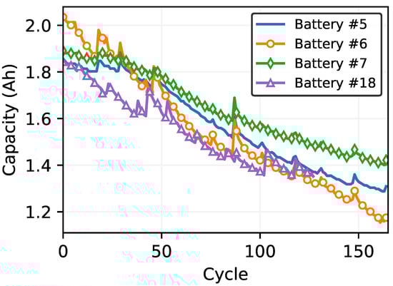 In this study, the lithium-ion battery dataset for SOH estimation was obtained from the NASA Prognostics Center []. As shown in Figure 1, we selected four batteries labeled #5, #6, #7, and #18 that were widely used for SOH estimation [,,]. This dataset consisted of operating profiles and measured the impedance of 18,650 lithium-ion batteries when charging and discharging at room temperature. The batteries were charged at a constant 1.5 A until the charging voltage reached 4.2 V and, then, continued to charge at a constant 4.2 V until the charging current dropped below 20 mA. The batteries were discharged at a constant current of 2 A until the voltage of the battery dropped to 2.7 V, 2.5 V, 2.2 V, and 2.5 V for batteries #5, #6, #7, and #18, respectively.