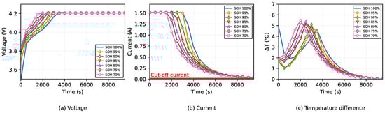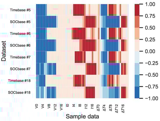 Figure 2 shows the sampling data of voltage, current, and temperature difference by constant time interval during charging of battery #5 with a total of 20 sampling points during one charge cycle. Figure 2a shows that the voltage of the aged battery reached 4.2 V faster than newer ones. However, regardless of their health condition, the battery’s voltage maintained the same 4.2 V after 4000 s. Therefore, almost 65% of voltage data had the same values. Similarly, a significant difference was not found in the current value in less than 4000 s or over 6000 s. The change in temperature difference of battery #5 was also slightly different after 6000 s. This result showed that the preprocessing based on time-domain features was insufficient to indicate the battery’s health state.