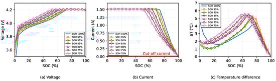 Figure 3 shows data sampled by constant relative SOC interval of battery #5 with a total of 20 sampling points during one charge cycle. Compared to Figure 2, the data preprocessed based on SOC basis differed for the aged battery and the new battery. Notably, the battery’s voltage sampling values had a significant difference between 0% and 70%. This value was 40% higher than the time-based preprocessing, showing only a 30% difference in voltage data between the old and new batteries. Figure 3 also shows that current and temperature variation in preprocessing based on SOC values was highly correlated with the SOH of the battery.