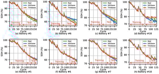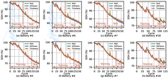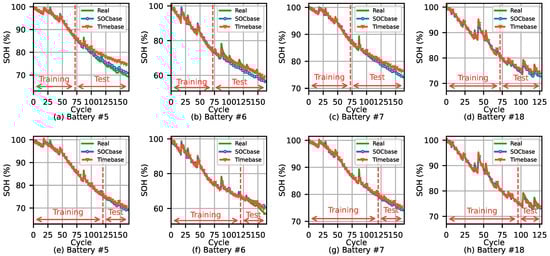 To validate the proposed method, the SOH estimation results of time-based sampling and SOC-based sampling were compared in this Section. To compare and infer which one performed better under limited training conditions, the SOH estimation was conducted in two cases: models trained with 72-cycle training and models trained with 120-cycle training without battery #18. In battery #18, one was a model trained with 72-cycle training, and the other was a model trained with 96-cycle training. In addition, all machine learning models were performed five times, and the average value of the results was used. Figure 6 shows SOH estimation results using the FNN in various batteries with 20 sampling points. The FNN with SOC-based datasets outperformed with the time-based datasets in 72-cycle training, as shown in Figure 6a–d. There was a significant difference in SOH estimation between SOC-based preprocessing and time-based preprocessing in SOH estimation results of Battery #5 and Battery #7, as shown in Figure 6a,c. However, the results of the two groups were similar on more training data, as shown in Figure 6e–h.