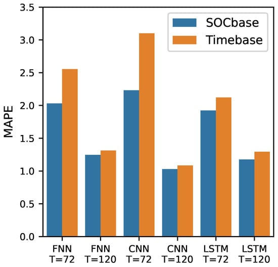 The LSTM model trained using SOC-based datasets had the lowest MAPE of 1.92 among models trained with less data. However, even when a simple FNN model with SOC-based datasets was used, the MAPE showed the second lowest value at 2.03, which was lower than any model using time series data. Table 2 shows that the total number of parameters in FNN, CNN, and LSTM was 4081, 16,441, and 38,941, respectively. As a result, the total number of parameters in the FNN was only 25% of that in the CNN and 10% of that in the LSTM. On small training data, these results showed that FNN with SOC-based datasets outperformed complex models, such as CNNs and LSTMs. In models trained with large data, the CNN trained using SOC-based datasets had the lowest MAPE at 1.03. However, there was no significant difference in MAPE between SOC-based data processing and time-based data processing, as shown in Figure 9. The results of this study indicated that a simple FNN model with SOC-based data preprocessing could be used to predict the SOH accurately, similar to complex models, such as CNN and LSTM. Consequently, these results showed that the preprocessing method proposed in this study could improve the accuracy of the FNN model, which was 10% of the parameters of the LSTM model, as much as LSTM.