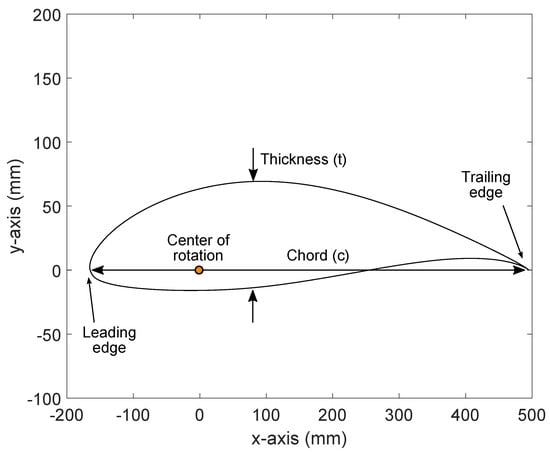 In the present study, the turbine blade profiles were determined based on the NACA 63-8XX series, which is commonly used in tidal turbine devices. A full-scale blade was assumed, considering ten foil profiles with the geometric characteristics, as presented by Payne et al. [11] and scaled up by fifteen to obtain the full-scale geometry. Table 1 presents the thickness (t), chord (c), radial location (r), and twist of each foil profile along the m rotor, while the profile at is presented in Figure 1 for a better visualization of the foil profiles. The shape of each of the ten foil profiles was obtained using the JavaFoil software [30], which provided the plane coordinates of each foil based on its and ratios. Subsequently, the coordinates were rotated following the twist angle, as described in Table 1, while the centre of rotation is located at one quarter from the leading edge, as shown in Figure 1. This point corresponds approximately to the aerodynamic center of each foil profile [31]. Then, the coordinates of each profile was imported in a CAD software [32] at the appropriate radial location (parameter r in Table 1), with the axis of the blade going through the centre of rotation of each foil profile. In the following, interpolated smooth curves were generated, using the discrete point of each foil profile, while these smooth curves were used for an interpolated lofted surface. For the sake of completeness, the leading edge of an airfoil profile is its foremost edge, which first meets the upcoming fluid separating its flow lines, while the trailing edge is the rear edge of an aerodynamic surface, where the fluid separated by the leading edge meets [33], as presented in Figure 1.