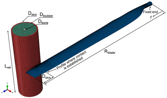 Figure 2 presents a three-dimensional model of a NACA 63-8XX blade created in SolidWorks [32] and then imported in commercial package ABAQUS [34]. The blade was considered as a cantilever. The profiles from r equal zero to r equal to were fixed, following the experimental set-up presented by Bahaj et al. [6], restraining all the displacements and rotations, while the other end is free. The blade was modelled using 83,965 C3D10HS elements. This type of general-purpose quadratic tetrahedron element provides superior stress visualization and exhibits improved convergence simulating contact and metal plasticity, based on the documentation of ABAQUS [34]. The mesh is denser around the region where contact was established with the sea animal to overcome convergence issues.