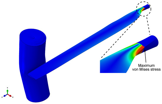 Visualization of stress distribution at the fixed end of the blade during impact; the contour plot represents von Mises stress [29].