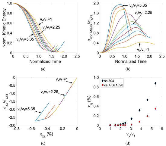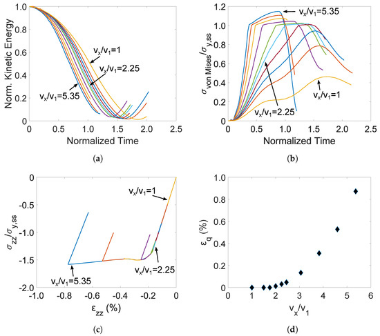 (a) Normalized kinetic energy with respect normalized time, (b) normalized von Mises stress with respect normalized time at the trailing edge of the foil profile at fixed end, (c) normalized normal stress at z-direction with respect the strain at the trailing edge of the foil profile at fixed end, (d) equivalent plastic strain, for the different velocities of the killer whale; carbon steel material of Grade AISI 1020 [29].