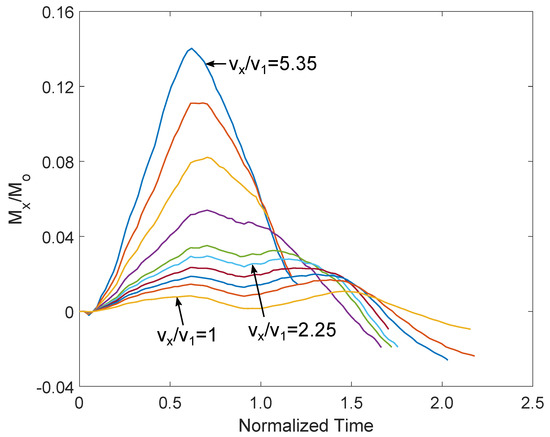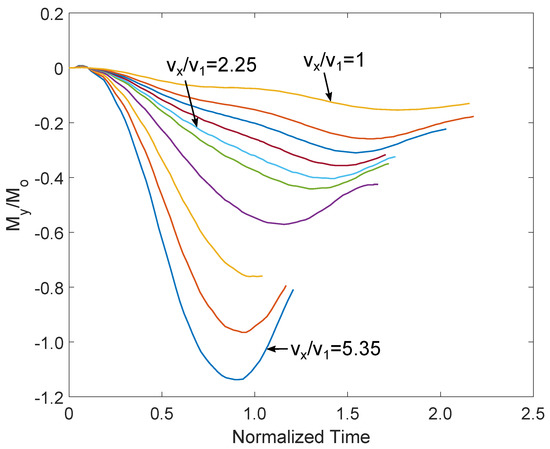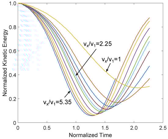 Figure 11 presents the normalized kinetic energy of the numerical model for the different magnitudes of velocity of the killer whale at x-direction, with respect to time normalized by the modal period of the first bending mode at x-direction (). In these analyses, the kinetic energy of the numerical model for each velocity case follows similar trend with the kinetic energy presented in Figure 4a and Figure 8a, where one-directional velocity was applied to the killer whale. Considering the case, where the normalized velocity at x-direction () of the killer whale is equal to 1, the kinetic energy of the model reduces, reaching the lowest value at time where the tidal turbine blade reaches its maximum deflection. However, it is observed that a significant amount of kinetic energy is still stored in the numerical model, due to the fact that the component of the velocity vector of the killer whale at y-axis is higher than the component of velocity vector at x-axis, corresponding also to large amount of kinetic energy compared to the initial kinetic energy of the numerical model. Increasing the magnitude of velocity of the killer whale at x-direction leads to increasing the ratio of the kinetic energy due to the velocity component at x-axis over the total kinetic energy of the numerical model. Therefore, the lowest value of kinetic energy reduces while increasing the velocity at x-direction, due to the fact that the ratio of the kinetic energy due to component of the killer whale over the total kinetic energy reduces.