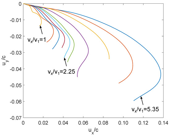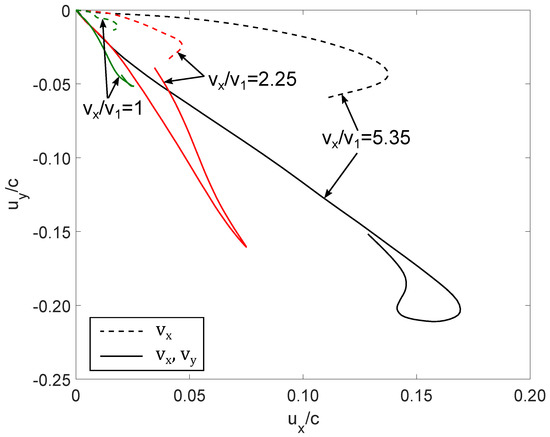 Considering the two-dimensional deflection of the tidal turbine blade, assuming velocity of the killer whale at x-direction, Figure 12 presents the translation (, ) of the centre of rotation of the profile of the blade at radial location equal to , normalized by the chord (c) of the foil profile, for normalized velocity of the killer whale at x-direction () equal to 1, and , while the component of the velocity vector at y-axis is equal to 1 m/s. Figure 12 shows that the trajectory of the velocity of the killer whale affects significantly the total deflection of the tip of the tidal turbine blade. More specifically, the total deflection of the tip of the blade could be calculated by the following expression: