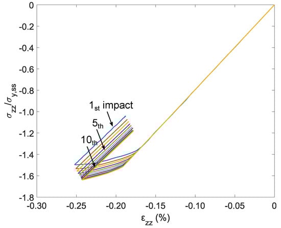 Figure 9 presents the compression at the trailing edge of the foil profile at the fixed end of the turbine blade for the first ten impacts. The normalized normal stress at z-direction () is shown at the foil profile at the fixed end of the turbine blade, with respect to the corresponding normal strain (), for the increasing number of impact events. The plastic deformation and the corresponding hardening of the stainless steel material during the impact loading, leads to increasing gradually the yield stress of the material. Therefore, the elastic energy which is dissipated into the stainless steel material, in order to reach the increased yield point, resulting in reducing the energy which corresponds to plastic deformation of the material. At this point, it should be noted that the initial energy is similar in every number of impact and corresponds to the initial kinetic energy.