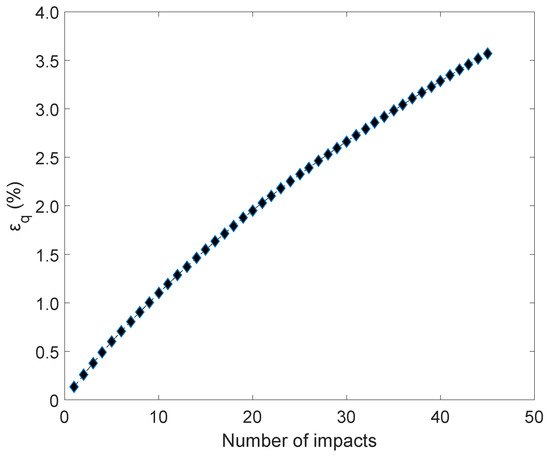 Furthermore, the equivalent plastic strain of the stainless steel material is also shown in Figure 10, with respect to the number of impacts. The figure shows that increasing the number of impacts the material hardens and the corresponding increase of the plastic strain rate decreases. Therefore, increasing the number of impacts and the corresponding hardening of the tidal turbine blade’s material, the velocity of the sea animal and the corresponding initial kinetic energy will result in elastic deformation of the blade exclusively. This is an important correlation between the number of impacts, required to result in elastic deformation of the material, and the initial kinetic energy, while it constitutes an important tool for structural health monitoring (SHM) [46], in order to identify potential damage of the material’s microstructure [47].