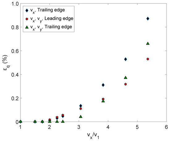 Figure 13 presents the equivalent plastic strain () of the stainless steel material of Grade 304 for one and two-directional velocity of the killer whale, for different normalized velocities at x-direction (). In case where the component of the velocity vector of the killer whale at y-axis is zero, a stress distribution is observed at the foil profile of the blade at the fixed end. It is shown that the blade is under tension at the leading edge and in compression at the trailing edge, while due to the geometric characteristics of the trailing edge, the tidal turbine blade deforms plastically at this region increasing the velocity () of the killer whale; the structural performance of the blade under these conditions is described in more detail in Section 3 and Section 4.1.