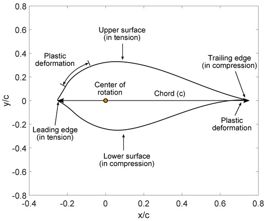 However, in case of two-dimensional velocity of the killer whale, the foil profile at the fixed end of the blade is in tension at the leading edge and at the upper surface, and in compression at the training edge and at the lower surface of the foil profile, as shown in Figure 14. Considering low values of the component of the velocity vector at x-axis, the turbine blade initially deforms plastically at the upper surface near to the leading edge, as indicated schematically in Figure 14, due to superposition of the two aforementioned stress distributions along the chord and the thickness of the foil profile. The superposition of the two bending stress () distributions of the foil profile at the fixed end, which are from leading edge to trailing edge and from upper surface to lower surface, are also observed in Figure 15, for the case of normalized velocity of the sea animal at x-direction () equal to . However, excessive compression is observed at the trailing edge of the foil profile, increasing the component at x-axis of the velocity vector of the killer whale, which leads to plastic deformation, as presented in Figure 13. Therefore, the trajectory of the velocity vector of the sea animal and the magnitude of the vector influences the two aforementioned stress distributions, affecting the region where plastic deformation of the turbine blade occurs.