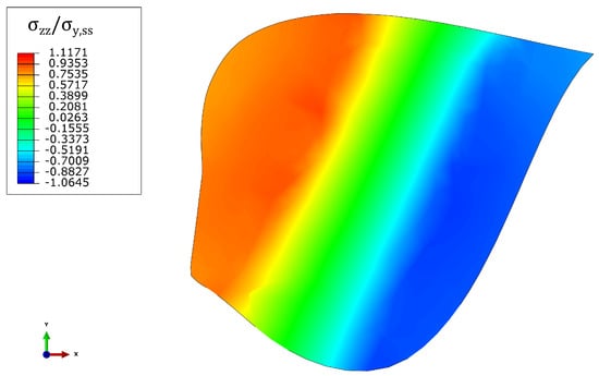 Visualization of the normalized bending stress () of the foil profile at radial location, in case of normalized velocity of the killer whale at x-direction () equal to ; m/s.