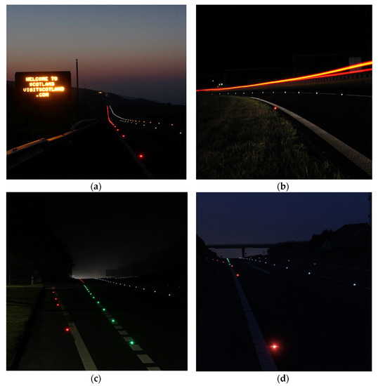 The case study for this research is a 20 km section of the A1 in Scotland immediately north of its border with England. The route here has a modest crash rate relative to other Scottish trunk roads; this has been associated with fixed-enforcement-camera treatment [23]. Nevertheless, local communities have continued to raise safety concerns, prompting a review by the national roads authority. The review found that the legibility of the route during hours of darkness, particularly around junctions, could be problematic. An improvement scheme was proposed [24] comprising the installation of 4200 solar-powered active road studs to highlight the approaches to nine junctions and two intermediate carriageway sections. The active road studs were effectively a like-for-like replacement of the reflective road studs which were already in situ. In accordance with the UK traffic sign regulations, white, red, amber, and green studs were used to indicate the centreline, nearside and offside edge lines, and the merge/diverge sections, respectively. Examples of typical active road stud installations implemented as part of the scheme are shown in Figure 1.