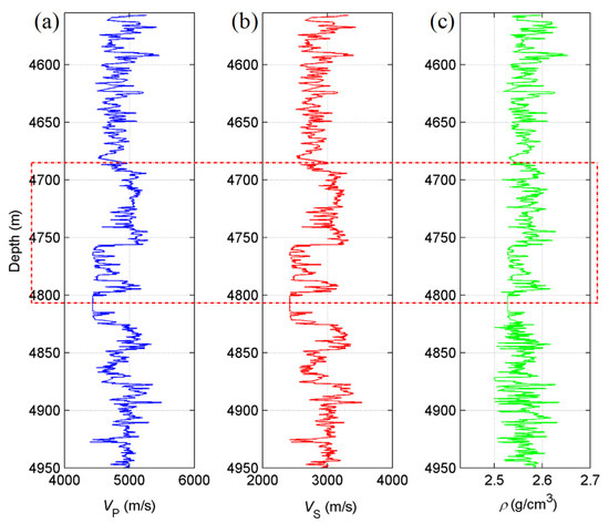Log profiles of Well P. (a) P-wave velocity, (b) S-wave velocity, and (c) density.