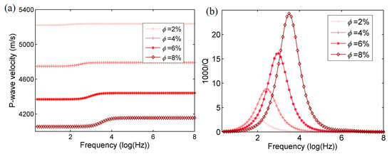 We consider the inclusion radius of 100 μm, and the bulk and shear moduli of the matrix are 33 GPa and 45 GPa, respectively. Gas has a bulk modulus of 0.02 GPa, a density of 0.089 g/cm3, and viscosity of 0.016 × 10−3 Pa·s. The crack porosity is set to 0.2%, and the total porosity varies as shown in Figure 6, where the P-wave velocity and dissipation factor are plotted as a function of frequency. Increasing porosity implies increasing velocity dispersion, attenuation, and relaxation frequency.