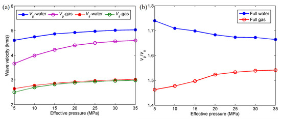 Figure 8b shows the velocity ratio. In the full gas saturation case, increases with increasing effective pressure and the opposite behavior occurs for full water saturation case.