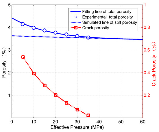 Experimental measurements can be performed to predict microcrack porosity based on the relation between porosity and effective pressure [45,46,47]. Stiff porosity can be obtained through a linear extrapolation of this relation and the microcrack porosity can be estimated as the difference between the total and stiff porosities. Figure 9 shows the different porosities as a function of the effective pressure.