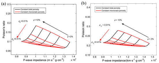 Figure 12 shows the RPTs with respect to total and microcrack porosities at ultrasonic and log frequencies, where the black and red curves isolines of total and microcrack porosities, respectively.