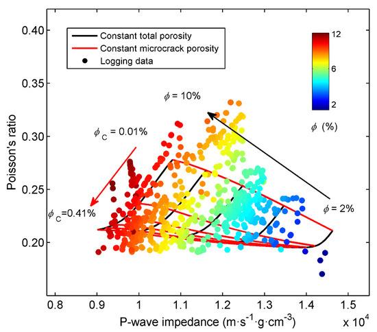 Figure 14 shows an RPT at 10 kHz and the inclusion radius of 200 , where the color bar indicates total porosity (the data are from the log data of well P). Most of the data have a porosity greater than 4%. With the increasing porosity, Poisson’s ratio increases and P-wave impedance decreases, and the agreement between data and theory is good.