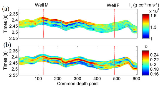 Figure 15 shows the P-wave impedance and Poisson’s ratio obtained from a seismic survey line. Well M shows high P-wave impedances at the top and low P-wave impedances at the bottom of the target layer, and high Poisson’s ratio in the middle. On the other hand, Well F shows the low impedance and Poisson’s ratio. Figure 16 shows the total and microcrack porosities predicted for the survey. Both porosities are high at Well M and low at Well F. The gas production reports of wells M and F are m3 per day and m3 per day, respectively, indicating that the predictions are consistent with the reports.