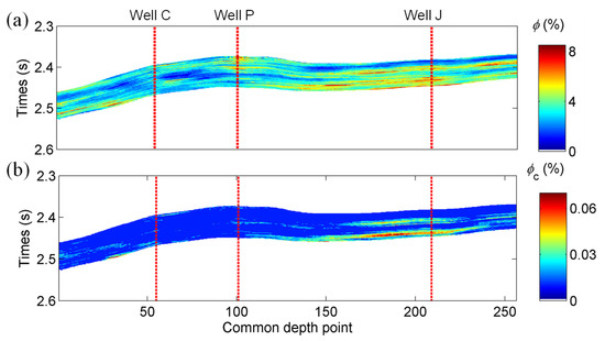Figure 17 and Figure 18 show results for another seismic survey line. Wells C and P show high P-wave impedances in the middle section, while Poisson’s ratio is low throughout the target layer around Well C. This well exhibits low total and microcrack porosities (see Figure 18). Although Well P shows a higher total porosity, the microcrack porosity is low. Well J shows the best potential for gas production with high total and microcrack porosities. The reports show that Well C produced almost no gas with non-industrial gas production flow, while Wells P and J produce and m3 gas per day, respectively. The predictions of the porosities are consistent with the production status.