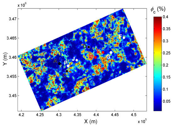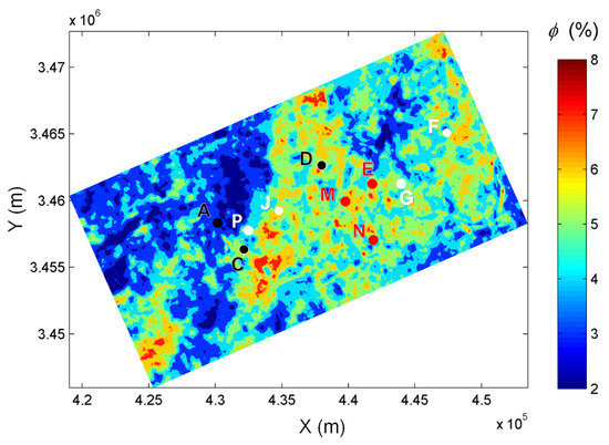 3D seismic slices of the work area of ~471 km2 are produced from the RPTs. According to the daily gas production rate, ten wells are classified into three categories, namely, extremely low (less than m3), low ( m3) and high (higher than m3) gas production wells. Figure 19 and Figure 20 show the corresponding maps of total and microcrack porosities, respectively.