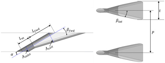 The geometry of a fan-shaped film cooling hole for this study was designed by Seo et al. [13]. The fan-shaped film cooling hole has been optimized with the RANS-based numerical simulation method based on a well-known 7-7-7 fan-shaped film cooling hole presented by Shroeder and Thole [14]. The design points for the optimization were derived by the Box–Behnken design, which is a design of experiments (DOE) for response surface methodology (RSM). RANS simulations for each experimental point were carried out when both the blowing ratio and density ratio are 2.0. Three shape parameters of a fan-shaped hole were selected as design variables: the forward expansion angle (, the lateral expansion angle (), and metering length ratio (Lm/D). The hole length to diameter ratio (L/D) was fixed at 6. The area-averaged film cooling effectiveness was selected as an objective function. In the optimized design, the forward expansion angle, and the lateral expansion angle of the optimized hole and metering length ratio were 13.3 degrees, 13 degrees, and 2, respectively. The shape of the film cooling hole is presented in Figure 1 and the detailed design variables are given in in Table 1.