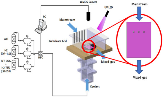 Nitrogen (N2) and a mixture of SF6 (75% of N2 + 25% of SF6) were used as the foreign gas to simulate the density ratio of the coolant. The flow rate of the air and the foreign gas supplied to the film cooling hole through the plenum chamber was controlled by a mass flow controller (FMA-2600A, OMEGA). Two screens and a honeycomb were installed in the plenum chamber to supply the coolant to the holes uniformly. The PSP (Uni-FIB 400, ISSI) was coated uniformly throughout the test plate, and an LED array and a sCMOS camera (PCO edge 3.1, PCO) were installed on the top of the test section to measure the emitting intensity of the PSP. The uncertainty of the blowing ratio was estimated to be ±6.7% when blowing ratio (BR) is 2.0 and density ratio (DR) is 2.0.