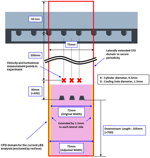 In this study, a commercial CFD code, Ansys CFX, has been used. Figure 3 depicts the computational domain (enclosed with red rectangular) of the test section. Cylinders with 9.5 mm diameter are located upstream of the film cooling hole to produce turbulence in the main flow as in the experiment. In the experiments, the width of the test plate, where the film cooling holes are located, was 72 mm and it has been extended by 1.5 mm (equivalent to 1D) toward each lateral side to satisfy the periodicity of the whole computational domain. Additionally, from the cooling hole downstream, the computational domain has been extended downstream by 105 mm (equivalent to 30D) to secure sufficient length for predicting cooling flow behaviors. In this study, LES analysis was performed in two steps as follows. At first, to validate feasibility of LES to resolve flow field downstream of the circular cylinder, two dimensional LES analysis including a row of circular cylinders has been carried out. Then, three dimensional LES analysis to predict the upstream turbulent boundary layer effect on the film cooling flow has been carried out.