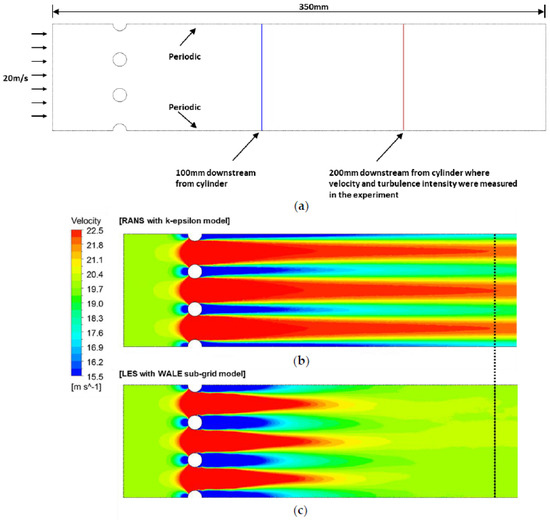 (a) Two dimensional CFD domain for validating circular cylinder downstream flow field; Comparison of velocity distributions between (b) steady state RANS with k−epsilon model and (c) LES with WALE sub−grid model.