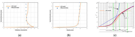(a) Comparison of turbulence intensity, (b) velocity along the vertical direction, and (c) non−dimensional velocity distribution at the velocity measurement point.
