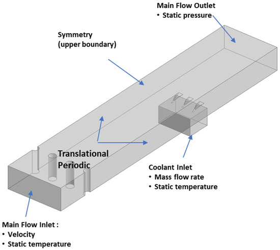 Boundary conditions for the three-dimensional CFD domain including a row of circular cylinders and fan-shaped film cooling holes.