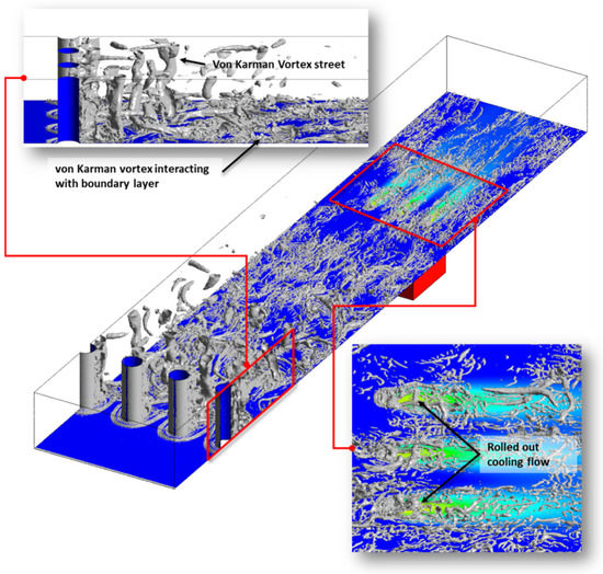 On the other hand, unsteady RANS could also predict the von Karman vortex shedding and behind the circular cylinder, however, their dissipation rate is higher than that of LES. Moreover, it is known that LES is more capable of predicting film cooling flow behaviors [2,3,7]. LES generally captures velocity field behind the cylinder successfully. For this reason, in this study, LES analysis has been used for predicting upstream circular cylinder effect on the film cooling flow on the flat plate, which is discharged far downstream of the circular cylinder row.