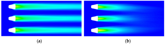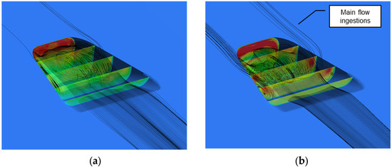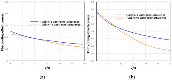 where is main flow temperature, is time averaged wall temperature, and is cooling flow temperature, respectively. Figure 9 shows film cooling effectiveness distributions with and without upstream turbulence in the boundary layer when the blowing ratio is 2.0. One interesting thing is that when there is no upstream turbulence effect, then the effective area of the cooling flow was far extended toward downstream. When the boundary layer is turbulent, then the coverage of the cooling flow becomes shorter. Moreover, near the cooling hole trailing edge, a high adiabatic cooling effectiveness region appears at the lateral side of the cooling hole in Figure 9a; however, this region disappears when the boundary layer is turbulent. Kang et al. [9] reasoned that that when the boundary layer is laminar, then the laminar boundary layer developed into the horseshoe vortex at the cooling hole leading edge and the horseshoe vortex flows along the lateral edge of the cooling without dissipating. On the other hand, due to the characteristic of the fan-shaped film cooling hole, the cooling flow is also injected into the lateral direction. Then, the horseshoe vortex kept the laterally injected cooling flow from lift-off or dissipation. For this reason, there appears high film cooling effectiveness region at the lateral side of the cooling hole when there is no turbulence information in the boundary layer. However, when the boundary layer is turbulent, the horseshoe vortex, initiated from the cooling hole, is no longer strong enough to suppress the lift-off of the cooling flow injection toward the lateral direction. Additionally, turbulence promotes lift-off of the cooling flow and its mixing with the main flow. For this reason, the coverage of the cooling flow is reduced. Kang et al. also showed that the boundary layer turbulence has a significant effect on the effective range of the film cooling flow. From this point of view, the turbulence information due the upstream circular cylinder in the current numerical simulation and its interaction with the cooling flow are reasonably predicted in the current LES analysis.