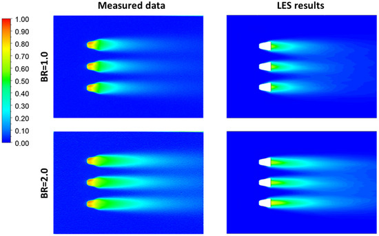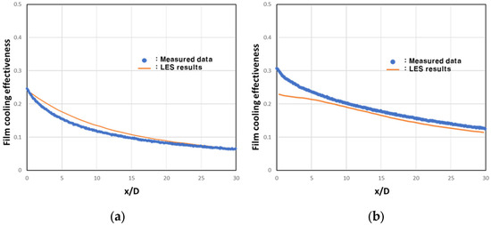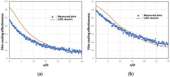 The uncertainty in measured film cooling effectiveness was calculated as ±7% at the film cooling effectiveness of 0.3 and ±2% at the film cooling effectiveness of 0.7. From the available measured data, measured data at BR = 1.0, 2.0 when DR = 2.0 were compared with LES results.