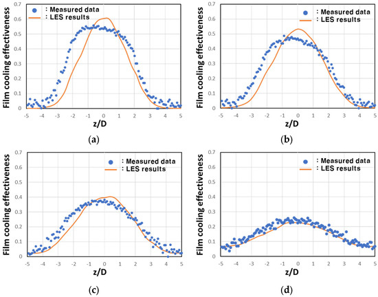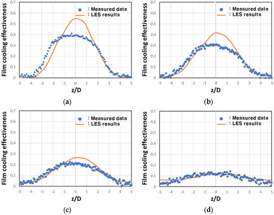 To compare the quantified film cooling effectiveness distribution on the flat plate from the LES results with measured data, the following values were evaluated: