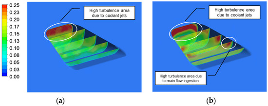 Characteristic turbulence intensity inside the cooling hole (a) without and (b) with upstream turbulent boundary layer when the blowing ratio is 2.0.