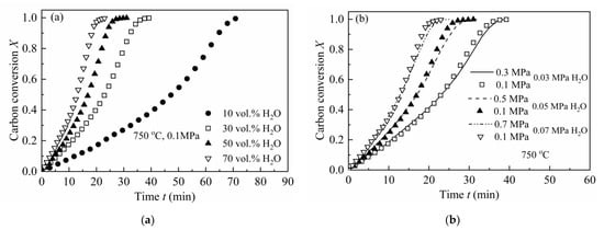 Two types of pressure effects on the gasification rate of CSC have been analyzed, i.e., fixed total pressure with different steam concentrations and fixed steam partial pressures with varying total pressures [43]. Figure 1a shows the effect of steam concentration with a fixed total pressure on the gasification rate of CSC. As can be depicted from the figure, the reaction rate of CSC increases with steam concentration.
