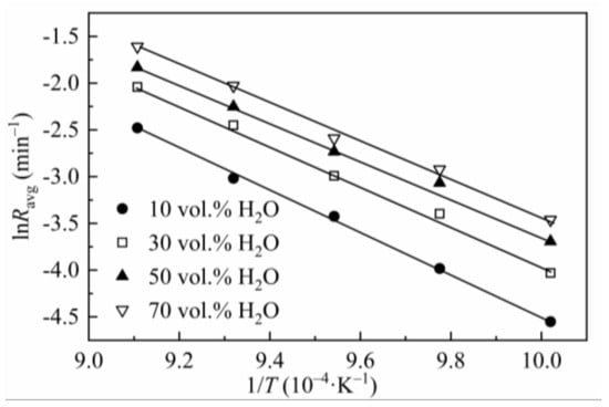 The effect of gasification temperature on the reaction rate of CSC was tested at 725–825 °C and 0.1 MPa with steam concentrations of 10–70 vol.%. Results were processed according to the method mentioned in Section 2.2 (the reaction rate was obtained by averaging the instantaneous reaction rates between X = 0.1 to 0.9). The gasification rates at different steam concentrations and temperatures were listed in Table 5, and the Arrhenius plots were shown in Figure 2. As seen in Table 5, at low steam concentrations (10 and 30 vol.%), the gasification rate grows very fast with temperature, i.e., the rate at 825 °C is nearly eight times at 725 °C (83.86/10.57 = 7.93, 130/17.78 = 7.31). At high steam concentrations (50 and 70 vol.%), the growth of gasification rate slows down, for the reaction rate of 825 °C is about six times that of 725 °C (160/24.92 = 6.42, 200/31.42 = 6.37). This phenomenon can be explained by the effect of temperature on the reaction order, in which the reaction order with respect to steam partial pressure decreases with the increase in gasification temperature (seen in Section 3.3).