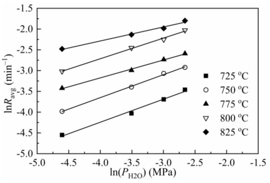 where b is a constant, PH2O is the partial pressure of steam, and n is the reaction order with respect to steam partial pressure, which can be calculated by linearizing Equation (15).