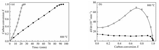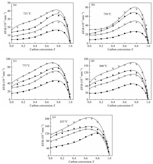 From the shape of the plot of dX/dt-X (Figure 4), it can be easily found that the maximum reaction rates are all at high conversion range, which has a remarkable difference with the plot of coal char gasification [26,27,28,29]. As mentioned by some researchers [19,23,24,55], the maximum gasification rate of biomass char appearing at high conversion was caused by the high content of AAEMs within char and the effect of enrichment of the AAEMs caused by carbon consuming. Therefore, MRPM proposed by Zhang et al. [19] was adopted to evaluate such biomass char gasification.