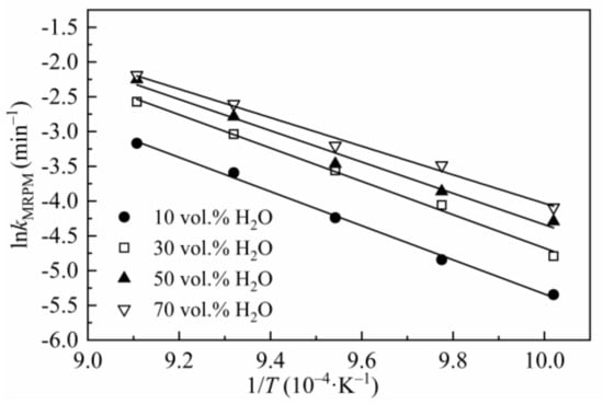 The activation energy Ea listed in Table 7 was obtained by linearizing Equation (8), and kMRPM was obtained from MRPM. Figure 5 is the Arrhenius plot of lnkMRPM versus 1/T for CSC gasified at 0.1 MPa with different steam concentrations.