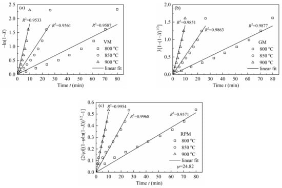 From Figure 6, it can be observed that the shape of dX/dt-X for H2O-CSC changes a lot compared with CSC, and the reaction rate no longer grows with carbon conversion; however, it decreases gradually (except for 850 °C, there is an increase before X = 0.2). This is an obvious distinction compared with the gasification behavior of CSC, for the gasification rate of CSC increases with carbon conversion to a maximum (around X = 0.7–0.8), then decreases. The MRPM proposed by Zhang et al. [19] is more suitable for biomass char that has a maximum reaction rate at the high conversion range (X > 0.393). Since the gasification behaviors of H2O-CSC changed, MRPM is no longer appropriate to predict its gasification behavior. Other nth-order models of VM, GM and RPM were applied to evaluate the experimental results of H2O-CSC. The method adopted here can be found in references [23,58]. The integral forms of VM, GM and RPM (Equations (16)–(18)) were used to get the reaction rate constant k, and then A and Ea were obtained by linearizing Equation (8).